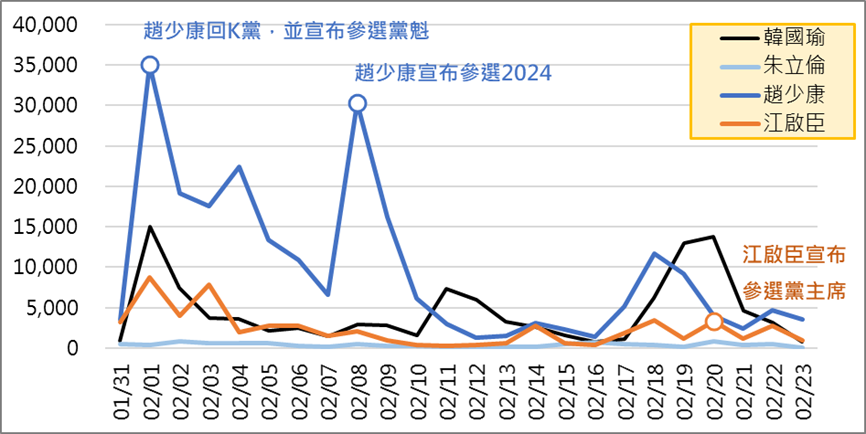 (2021.02.24)面對(duì)趙少康重磅回歸國(guó)民黨並劍指黨魁大位,現(xiàn)任黨主席江啟臣於2/20宣布參選連任,自我定調(diào)將成為「造王者」輔佐黨內(nèi)選將、不參與2024總統(tǒng)大選。不料,高調(diào)爭(zhēng)取連任的記者會(huì),聲量非但落後趙少康,更強(qiáng)碰黨魁呼聲極高的韓國(guó)瑜同日在FB粉絲專頁貼出小林村影片,江啟臣在網(wǎng)路聲量遭受兩強(qiáng)夾擊,輿情關(guān)注無法聚焦,黨主席這條路看似顛簸,能否走下去值得觀察。