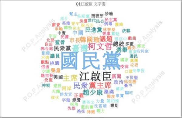 觀察《山水民調(diào) X 輿情觀測(cè)》文字雲(yún)發(fā)現(xiàn),自江啟臣20日表態(tài)至今,網(wǎng)路輿論多將他與各路黨主席可能競(jìng)爭(zhēng)人選並提,鮮少針對(duì)其個(gè)人或參選聲明內(nèi)容多做討論。而特別的是,臺(tái)北市長(zhǎng)柯文哲被連帶提及的比例不低,由於江啟臣是國(guó)民黨現(xiàn)任黨主席,將「藍(lán)白合」的發(fā)球權(quán)握在手中,且部分在野黨選民對(duì)「藍(lán)白合」具有期待,因此相較趙少康、韓國(guó)瑜、朱立倫等人,江啟臣更具備議題領(lǐng)導(dǎo)權(quán)。