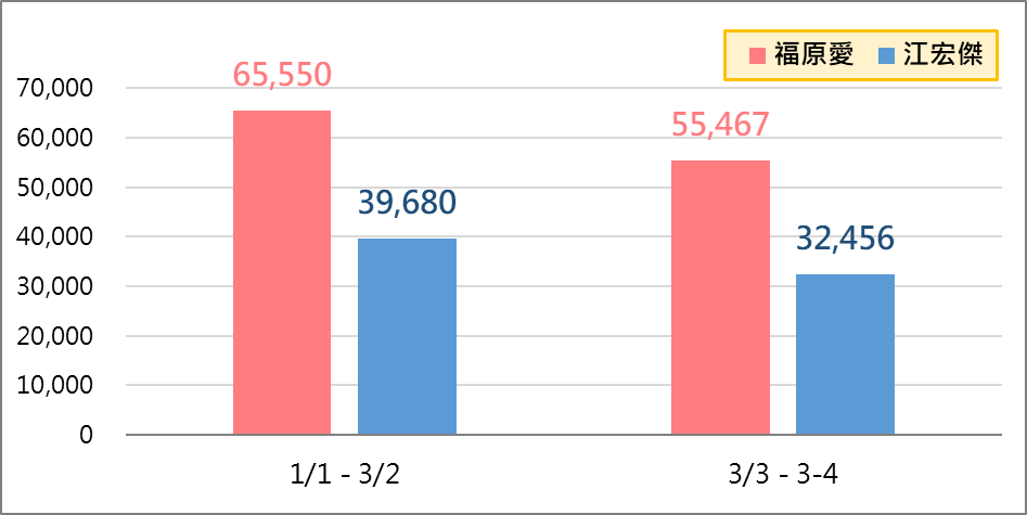 據(jù)《山水民調(diào)X輿情觀測》聲量趨勢資料可知,3/3福原愛與「橫濱大谷翔平」同遊照片曝光後,網(wǎng)路上相關討論熱烈至極,兩天內(nèi)提及「福原愛」的討論聲量共55,467則、「江宏傑」的討論聲量亦有32,456則,其火紅程度更勝上個月趙少康鬆口參選下屆總統(tǒng)(2/8,35,328則討論),可見金童玉女的婚姻崩壞,十分受到吃瓜群眾注意。