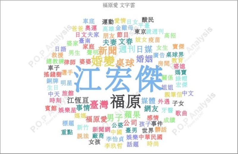 據(jù)《山水民調(diào)X輿情觀測》文字雲(yún)資料可知,在3/3-3/4期間,以福原愛為主題進而檢視相關討論,發(fā)現(xiàn)有參雜著不少「婆媳」、「婆婆」、「夫家」、「江恆亙」等關鍵字,不難聯(lián)想到外界易將婚變原因,與婆媳關係進行串連,尤其日媒把江宏傑的大姊江恆亙封為「妖怪大姑」,並爆發(fā)粗口辱罵福原愛一事後,相關討論在網(wǎng)路上變本加厲。